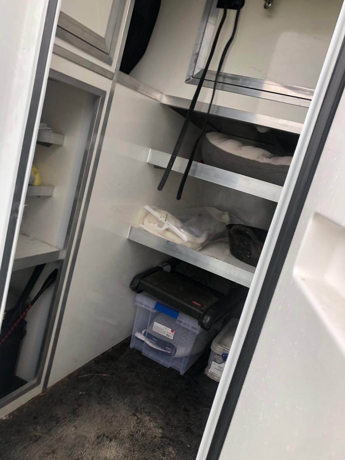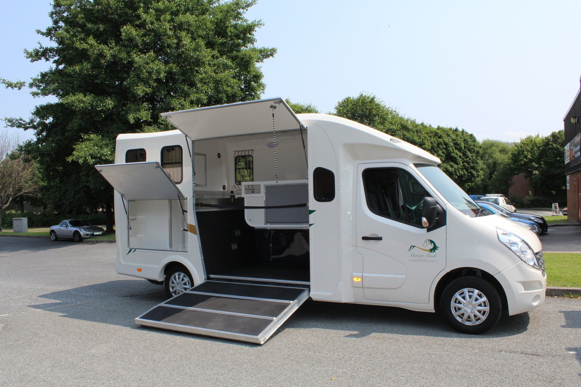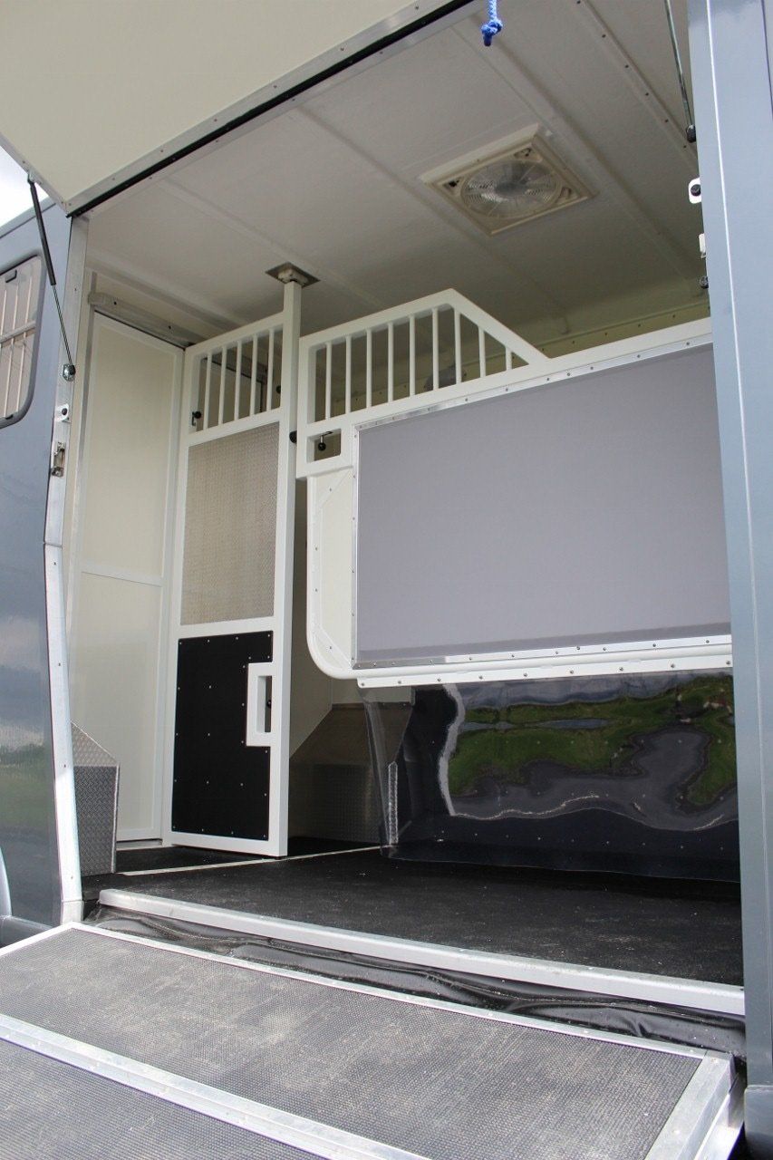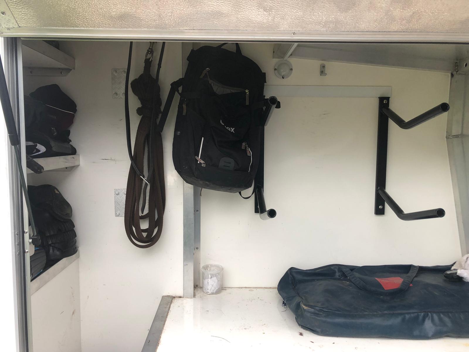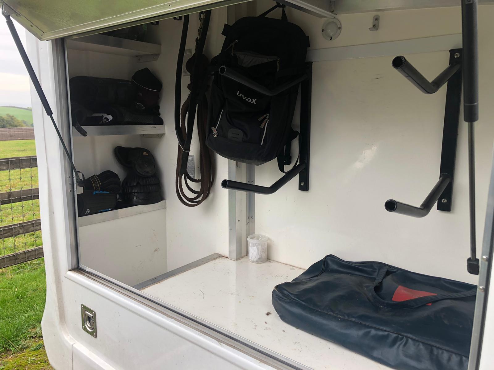 Most commonly specified with the full bulkhead option, in the back, in place of the normal day living you will find a hatch through to the horses, plus a hanging area, sealed cupboard and shelving to carry whatever you wish: plus an area for long boots.