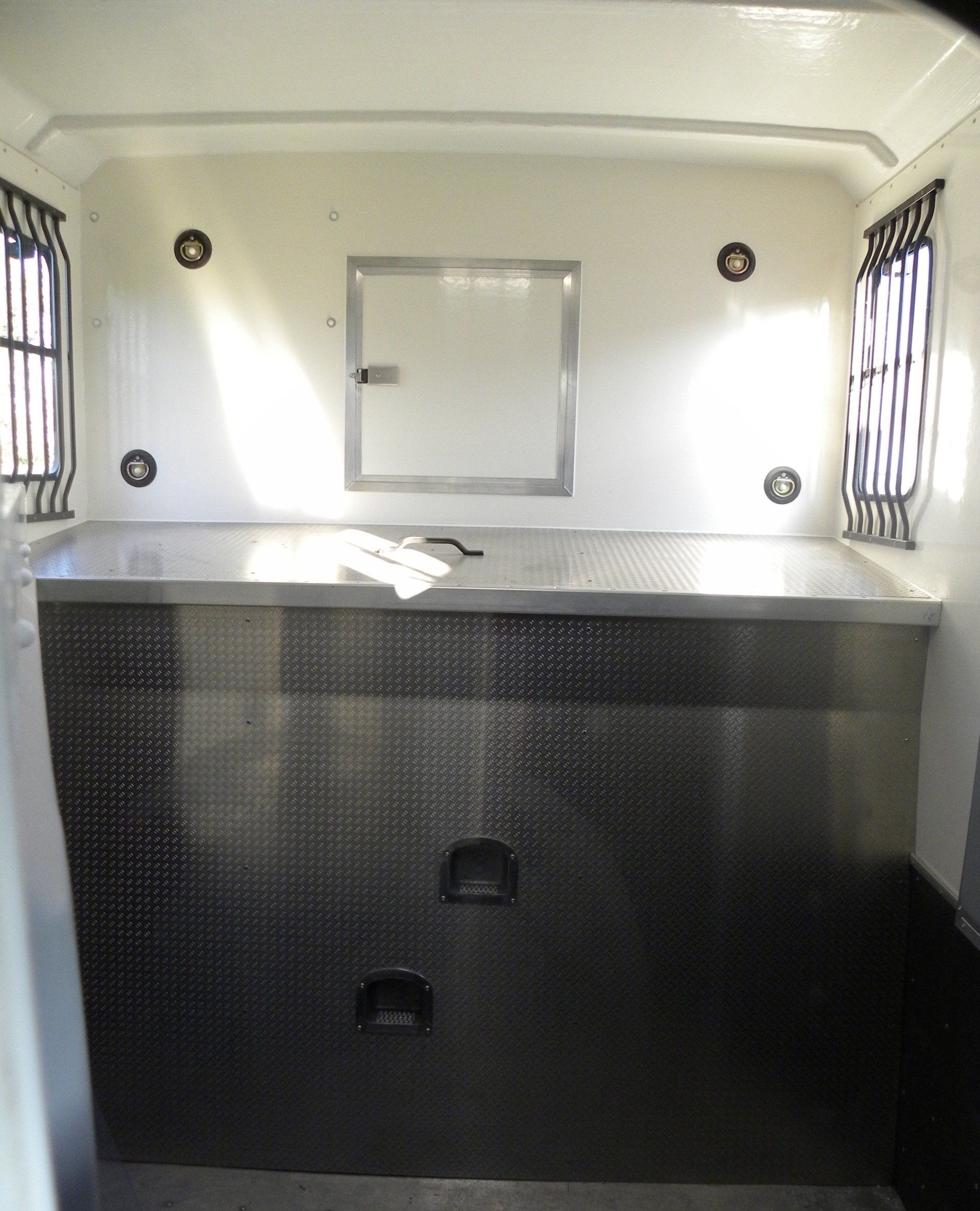 In this configuration, there are two distinctly separate stalls with no breast bar. The horse balances without the aid of a breast bar. Horses seem to manage this quite well and it is a fairly popular configuration. They are sometimes called stallion stalls because it is possible to have the stalls so the horses are completely separate with no vision from one stall to the other - more suitable for a stallion travelling with another horse. This is also often the configuration chosen by transporters as they do not need the enhanced day living and feel this configuration is good when transporting horses that they do not know, may have quirky tendencies and if transporting two, may not know each other. Obviously there is no breast bar or lockers for the horse to jump on. You can have a dividing partition that is solid to the floor. The disadvantage of this configuration is that you lose locker space. Recently we made a half and half - the passenger side had a long stall and the ramp side had the locker in front of the horse which gave this particular customer the best of both worlds