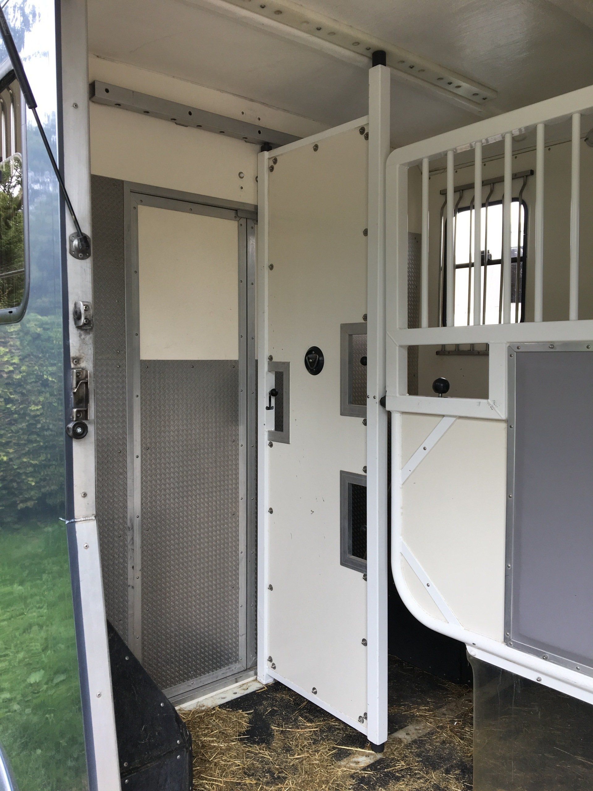 In this configuration, there is no door to the living - there is a hatch through to the rear living. This is a configuration which is appropriate where is it perceived that their horses may be tempted to jump up onto the lockers - the locker tops are angled so the horses slide off more easily should they be foolish enough to attempt this. Further more is you are going to travel horses loose or travel a lot of different horses or travel mares and foals you may feel the advantages of this configuration are for you